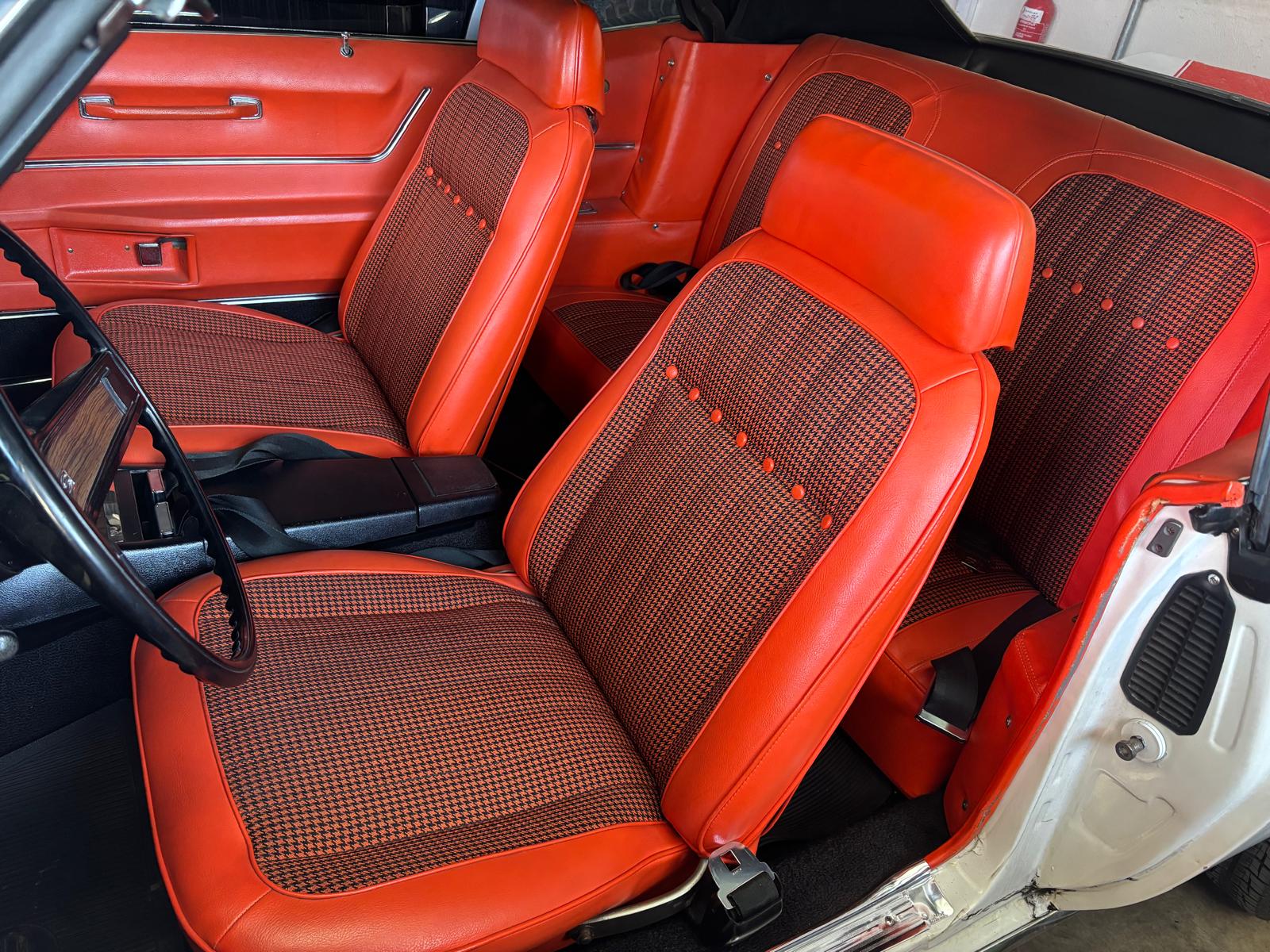 Et pour l'intérieur : Sièges en vinyle orange avec des inserts en tissu pied-de-poule (houndstooth) orange et noir.